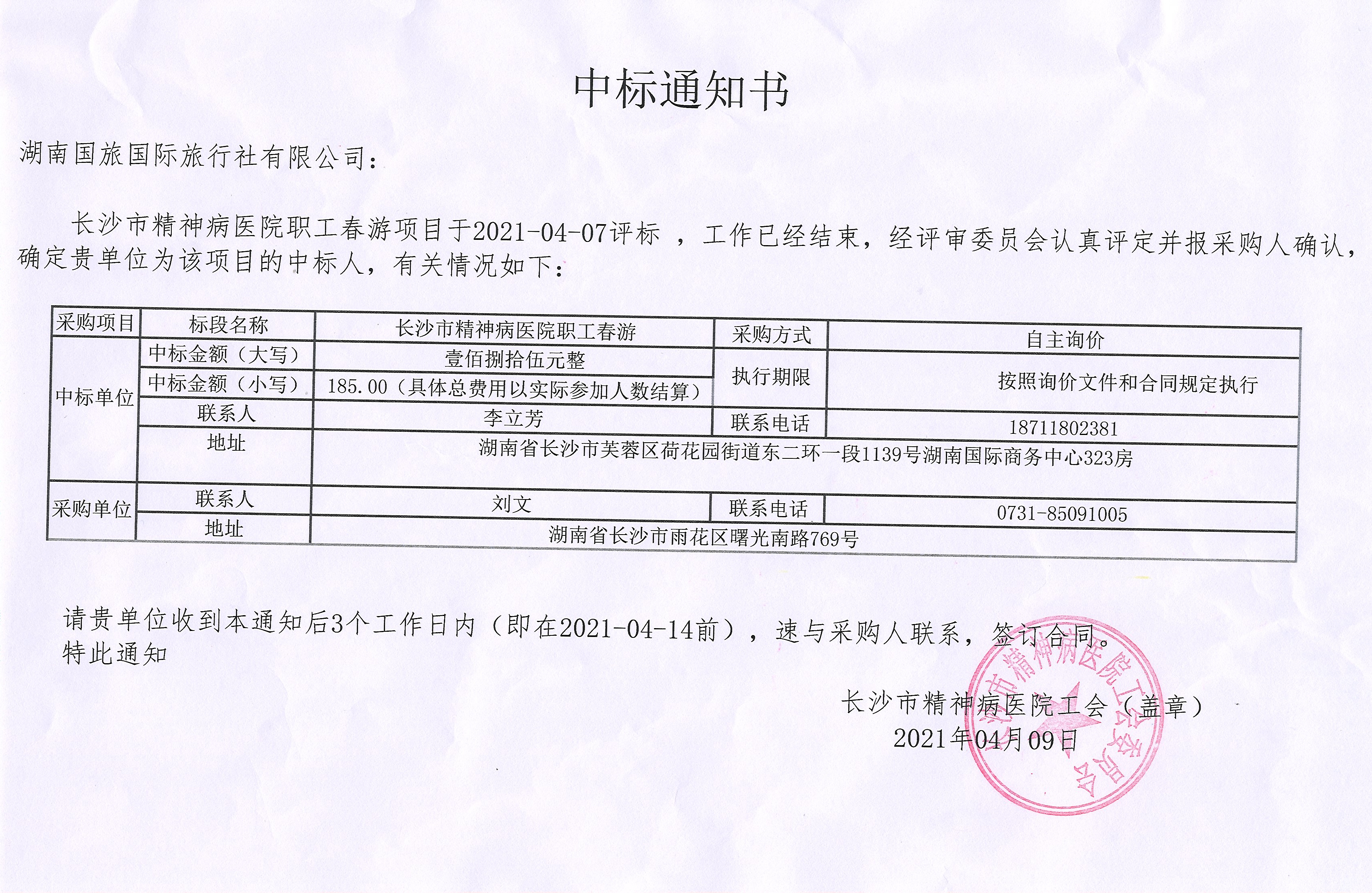 长沙市精神病医院职工春游项目询价采购项目于2021年4月2日结束,现将成交结果公告如下: