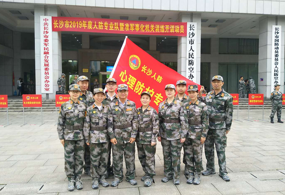 长沙人防心理防护队于2018年6月成立,该专家队伍是由市第九医院20名骨干队员组成,其中精神卫生专家和心理医师15名,护士5名,主要负责战时心理防护与干预工作。自成立了以来,在长沙市人防办的指导下,人防心理防护专业队多次组织防空、心理危机干预等专业培训及应急演练,提升心理危机干预能力;同时,专业队队员积极参与接听心理援助热线,为市民进行免费心理危机干预服务,及时有效解除了市民的心理健康危机。
