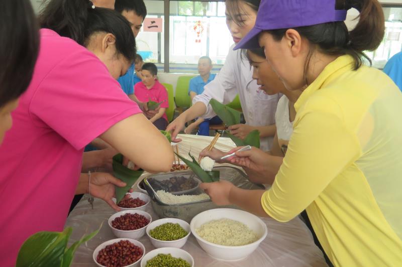 精神科五病室的精障患者小徐是位聋哑人士,虽然他不能表达也听不到志愿者指令,但被大家热闹的氛围所感染,他也在一旁默默地模仿着志愿者包粽子的方法,工作人员看在眼里,走上去一边手把手的教小徐,一边耐心的说着“放点糯米,加点五花肉,再放上些糯米,再扎好绳子……好啦,成功了。” 包粽子的乐趣,让他们个个笑容满面。